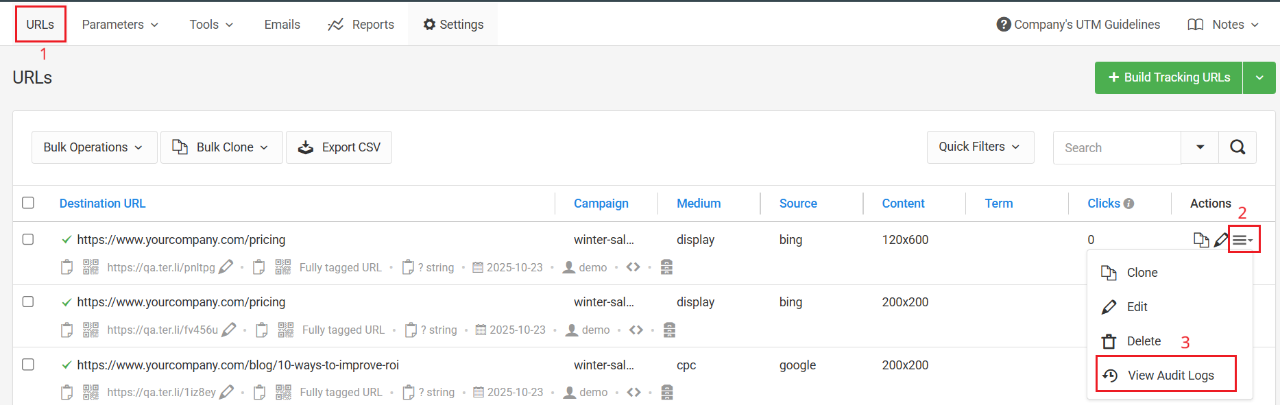 For a granular history of a single URL or UTM parameter, you can access its individual audit log.