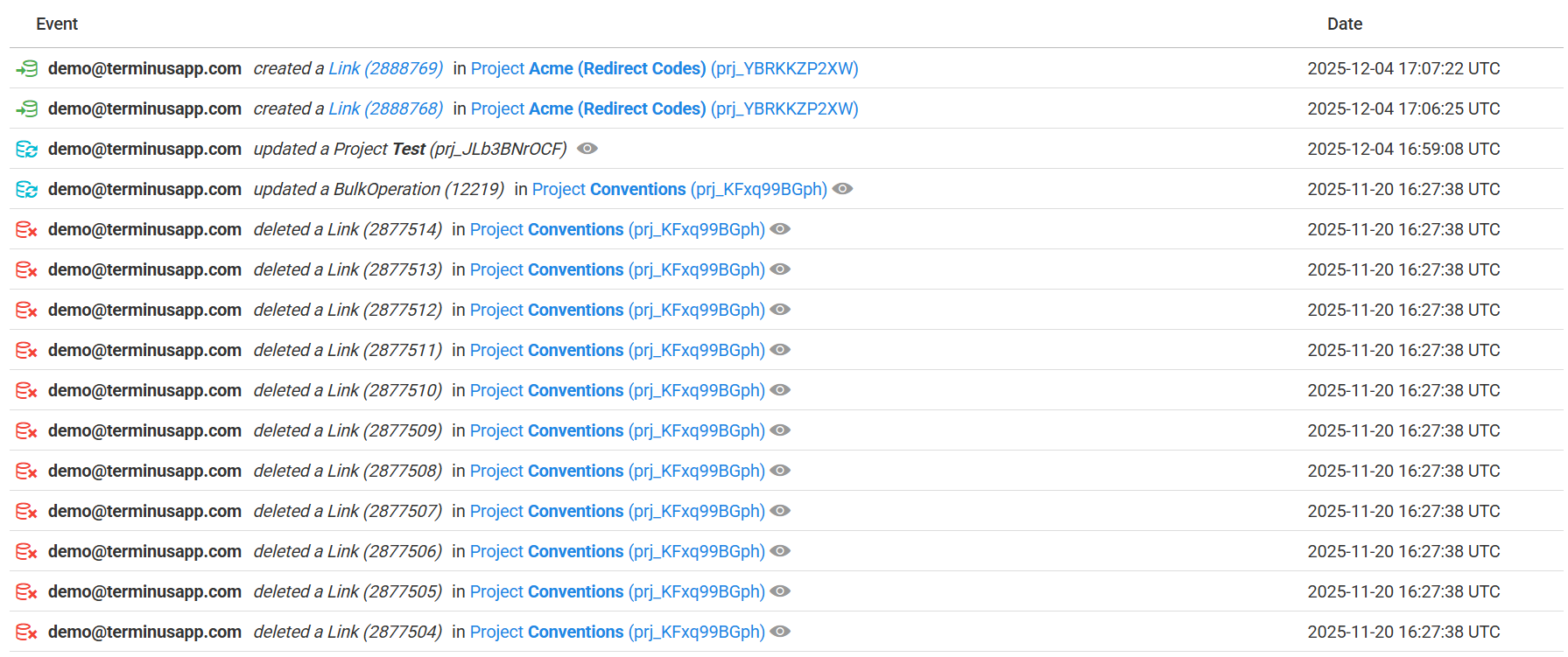 With Audit Logs, you can see who created, edited, or deleted URLs, UTMs, projects, and other resources. This transparency is available at both the high-level account view and for individual items.