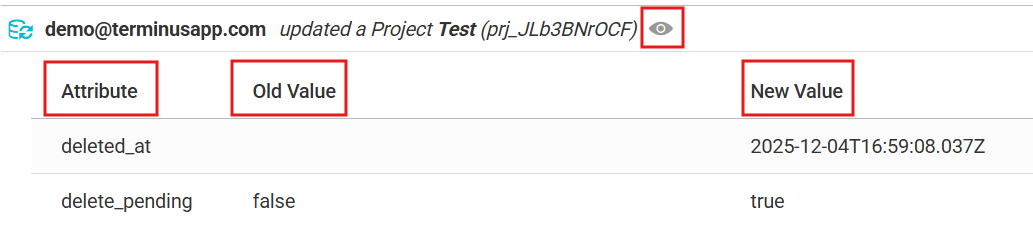 To investigate a specific action i.e., Update or Delete, click the Eye icon (View Details) next to the log entry. This opens a panel with granular technical data, allowing you to understand exactly how the data changed. A detailed table breaks down the event into three key columns: