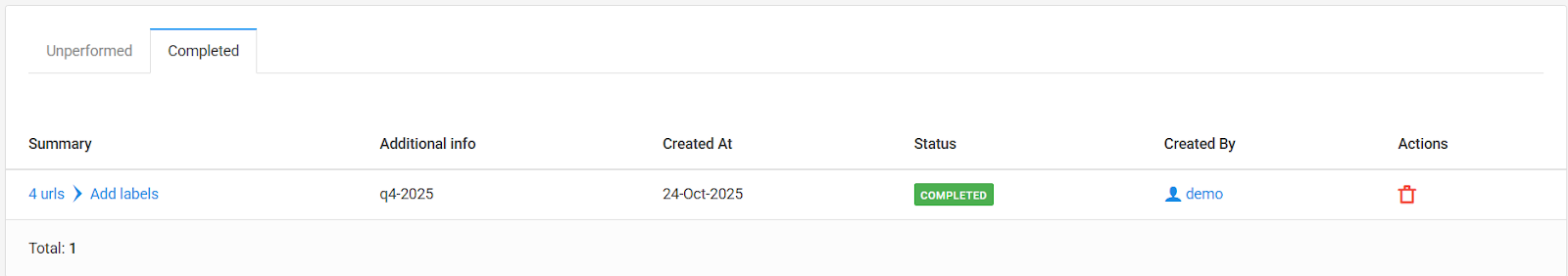 This is your audit log. It's not an action on URLs, but a way to see what actions have been taken. View a complete history of all bulk actions performed.