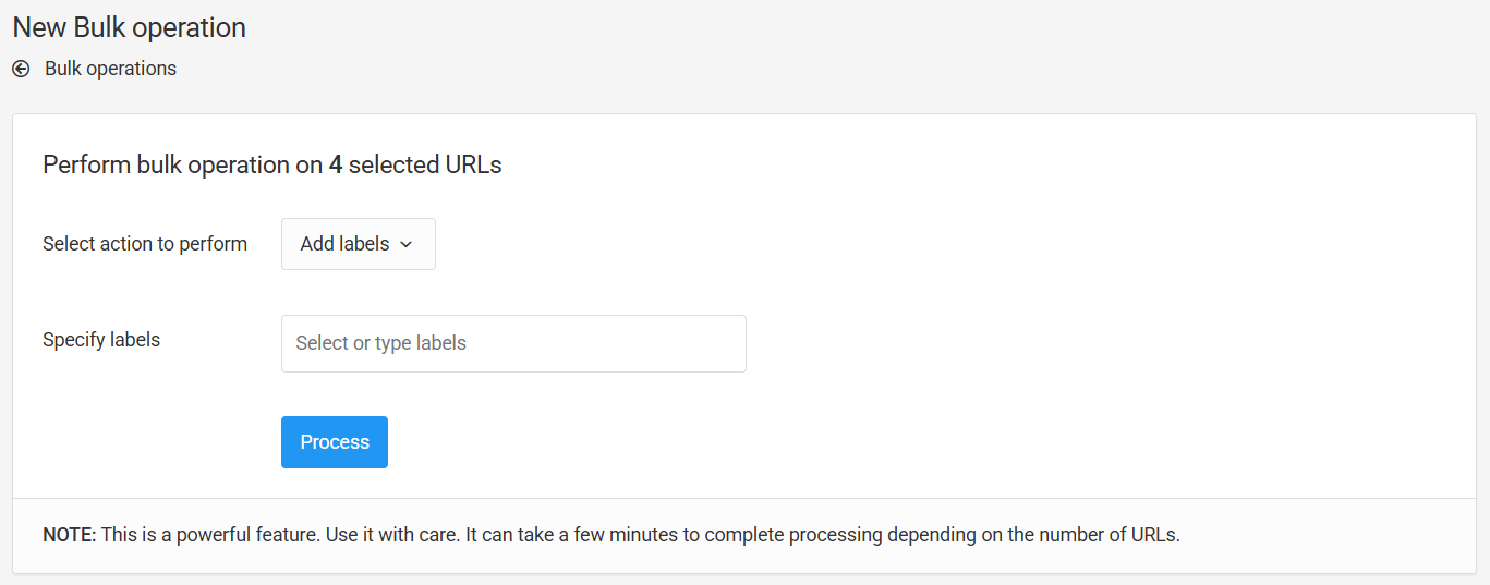 - Select your URLs, then click Bulk Operations > Add labels (or Remove labels).