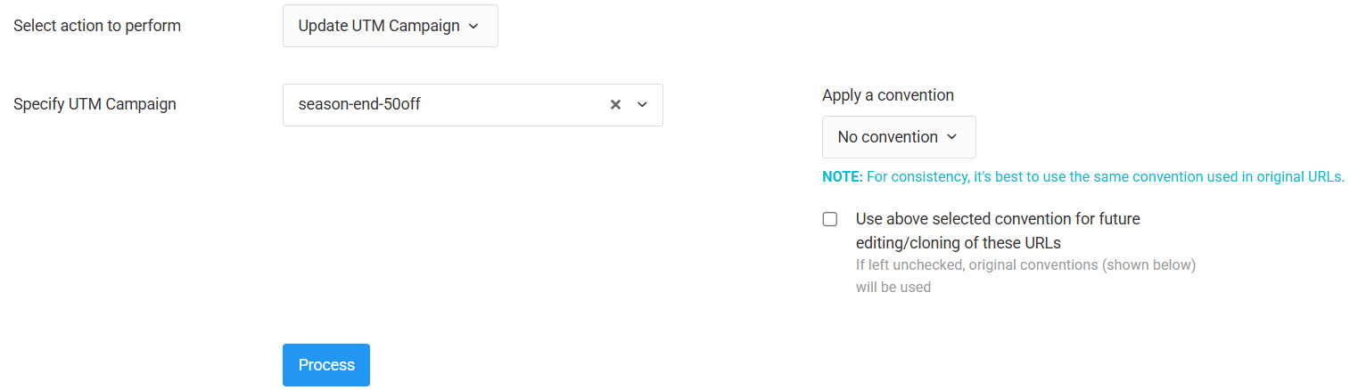 This is the perfect tool for fixing typos or moving a set of links to a new campaign. This example uses Update UTM Campaign, but the steps are identical for Medium, Source, Content, and Term.