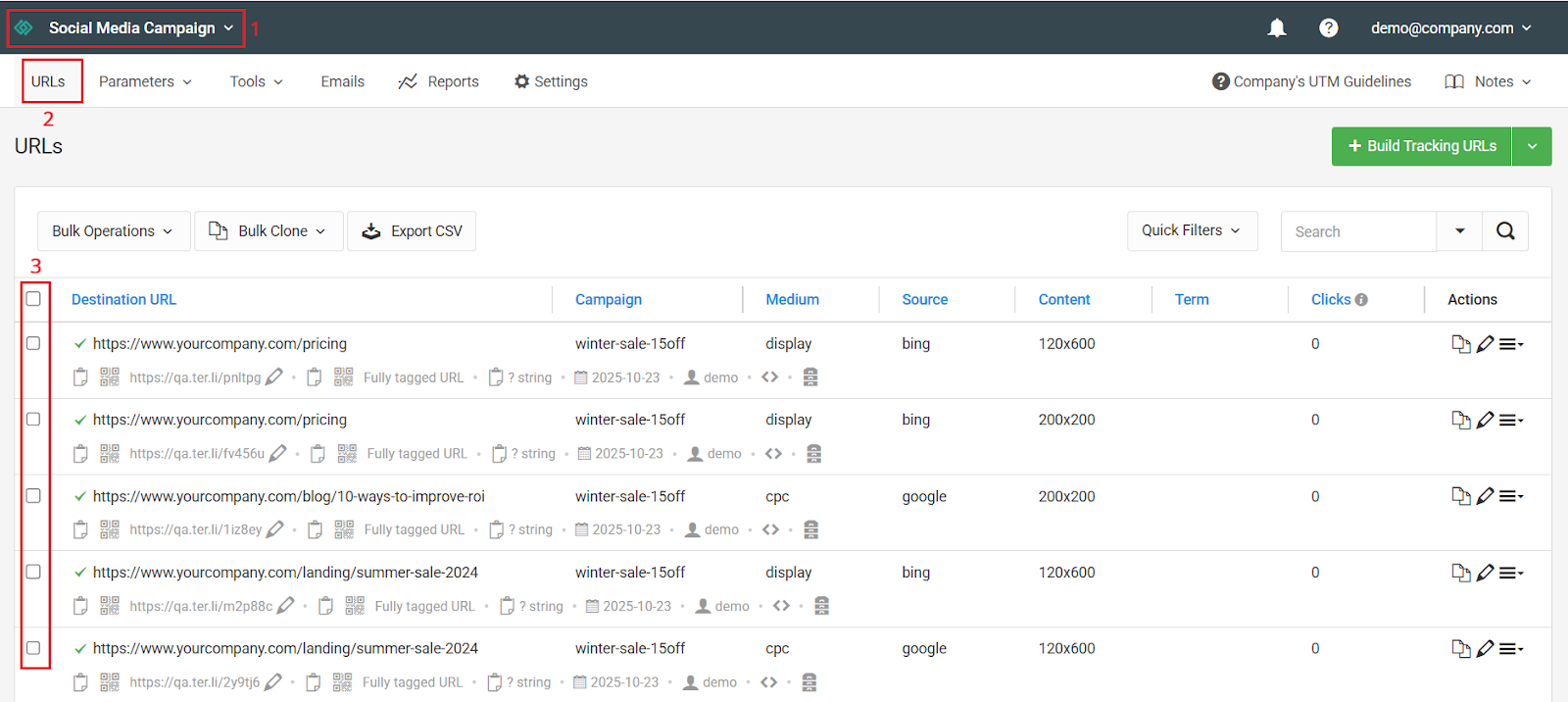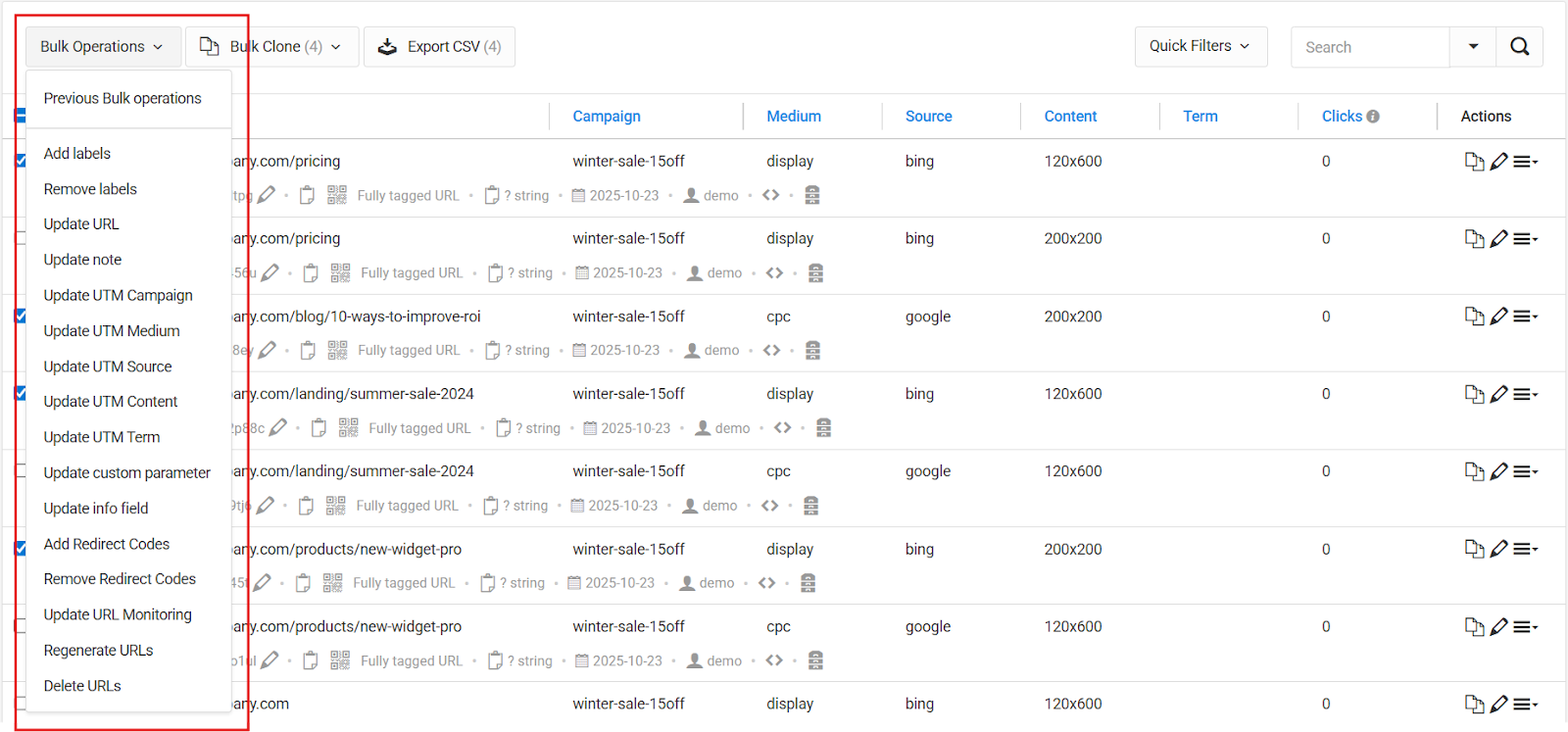 - Select your URLs, then click Bulk Operations > Update UTM Campaign.